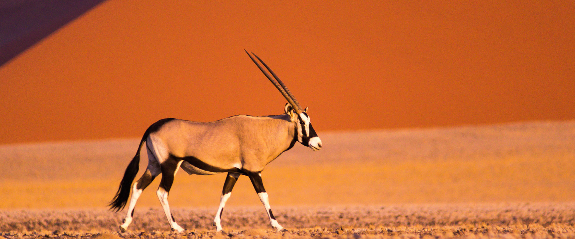 Here the waters of the Tsauchab River are blocked from reaching the ocean by a formidable wall of dunes, stretching sixty kilometres to the sea. Occasionally the flood waters of the river reach Sossusvlei and gather to form a small, shallow lake in the middle of the dunes. This desert wilderness is home to a surprising variety of animals which thrive in a desert environment. Oryx, springbok, aardwolf, ostrich, hyena, bat-eared fox, Cape fox, Burchell’s Zebra and Hartman’s Mountain Zebra, can all be viewed here. There are also over 115 different variety of bird species here, including sociable weavers, black and martial eagles and the dune lark.